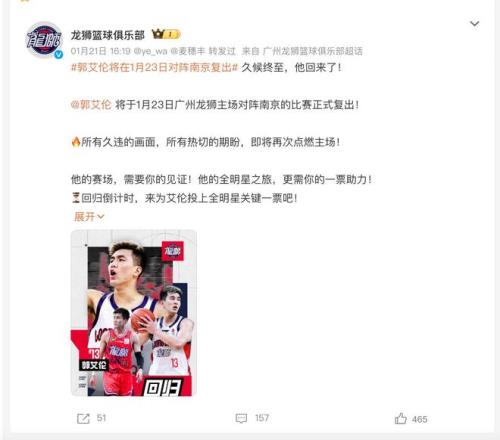 官宣!郭艾伦复出