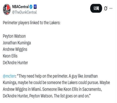 “湖人的外线急需补强。像乔纳森-库明加这样的球员,或许会是球队的追逐目标。还有可能是在迈阿密效力的安德鲁-维金斯。另外,萨克拉门托的基翁-埃利斯,以及德安德烈-亨特、佩顿-沃特森等人也在备选之列。这份潜在引援名单还有很长。”