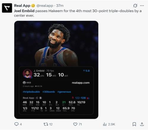 3.恩比德第六次30+三双超过奥拉朱旺升至历史中锋位置第四;