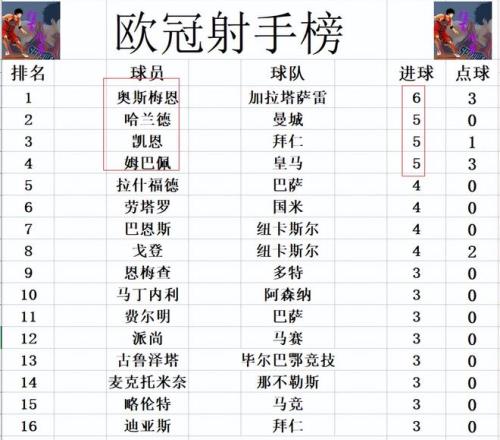 射手榜方面,奥斯梅恩缺阵,还是6球位列榜首,哈兰德,凯恩和姆巴佩5球并列第2。拉什福德,劳塔罗,巴恩斯和戈登4球并列第5。马丁内利,费尔明,麦克托米奈,略伦特等人3球刚好挤入前十。