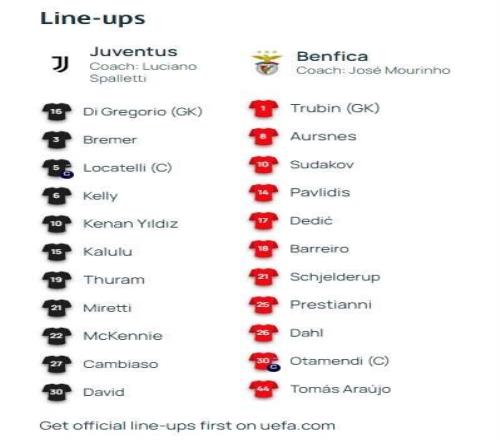 北京时间1月22日04:00,欧冠 联赛阶段 第7轮,尤文图斯主场迎战本菲卡,赛前双方球队首发名单公布如下: