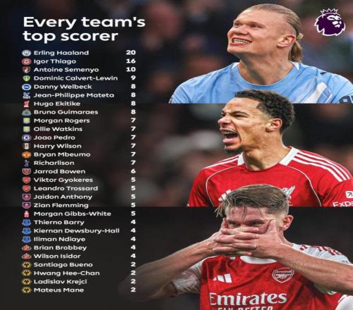 英超联赛官方统计并公布了本赛季至今(截至当前赛季阶段)各支球队在联赛中的头号射手。曼城的埃尔林·哈兰德以20球遥遥领先,高居榜首。其他表现出色的球员包括布伦特福德的伊戈尔·蒂亚戈(16球)和伯恩茅斯的塞梅尼奥(10球)。