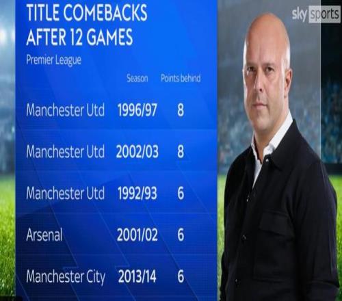 据《天空体育》的数据统计,此前,第12轮落后第一名6分或更多的分还能夺冠的情况,英超历史只出现过5次。