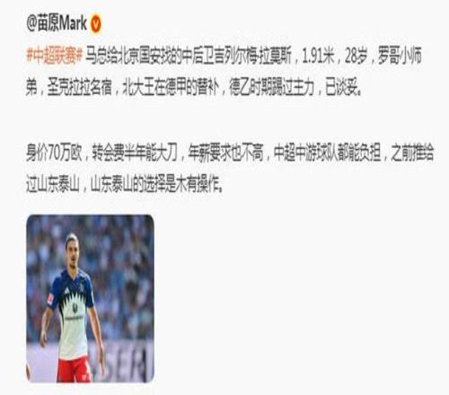 苗原:国安谈妥汉堡中卫拉莫斯,年薪不高,他曾被推给泰山